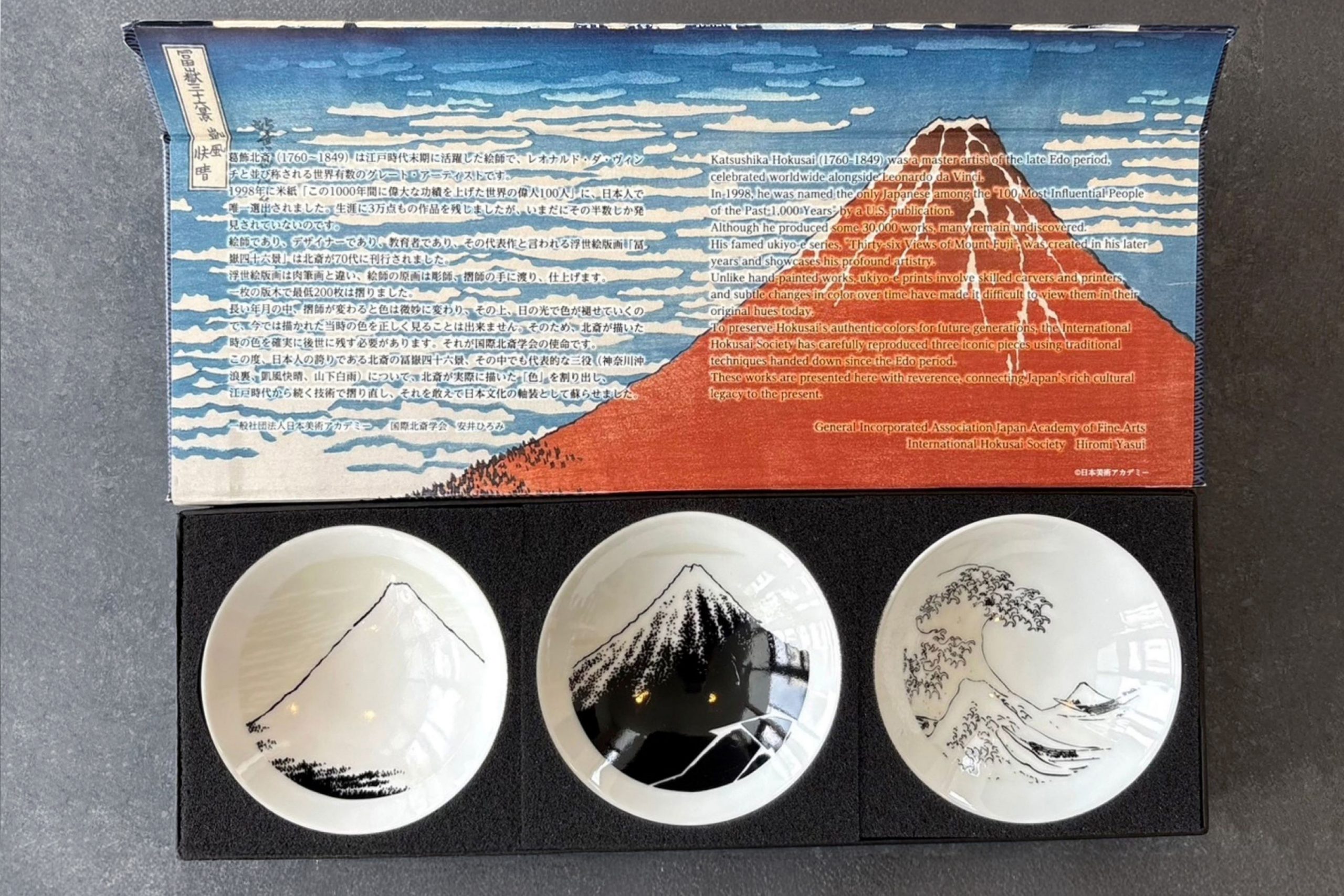 「冷感北斎平盃3点セット」は、葛飾北斎の名作「富嶽三十六景」をモチーフにした美濃焼のぐい呑みセットで、日本の伝統と現代技術を融合させた逸品です。常温ではモノクロの線画が、冷たい飲み物を注ぐと色彩が浮かび上がり、まるで絵画が完成するような感動を味わえます。図柄には「凱風快晴」「神奈川沖浪裏」「山下白雨」の3作品が選ばれ、それぞれの名場面がぐい呑みの内底に美しく再現されています。磁器製の器は扱いやすく、口当たりも良いため、普段使いから特別な席まで幅広く利用できます。専用化粧箱には北斎の作品が贅沢にあしらわれ、箱を開けた瞬間から「日本美」の世界観が広がります。外装には「神奈川沖浪裏」、内側には「凱風快晴」が配置され、細部までこだわった仕様です。この商品は、日本美術アカデミー監修のもと、品質と芸術性を両立させた「用の美」を体現しており、海外からのゲストへの贈答品や訪日観光客向けのギフト、企業の公式記念品としても高い評価を受けています。