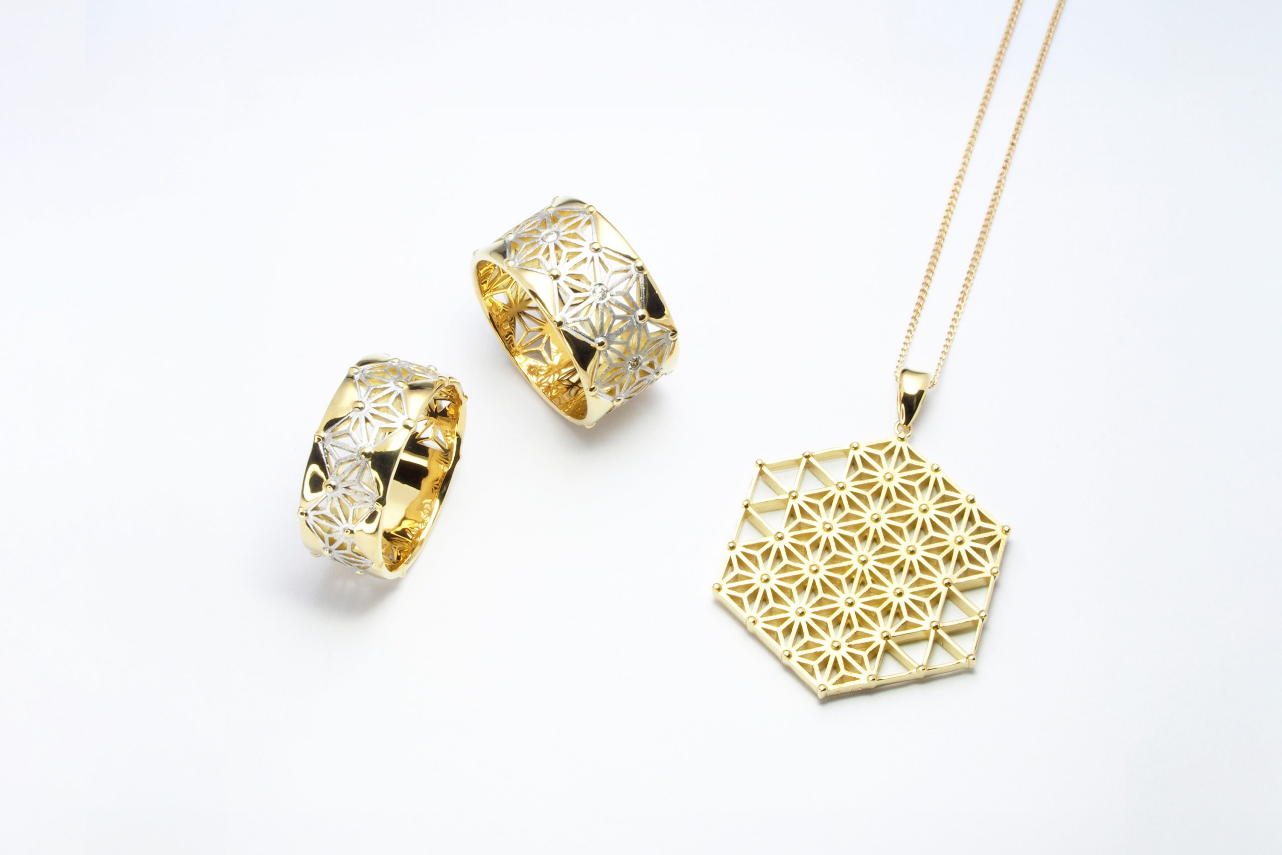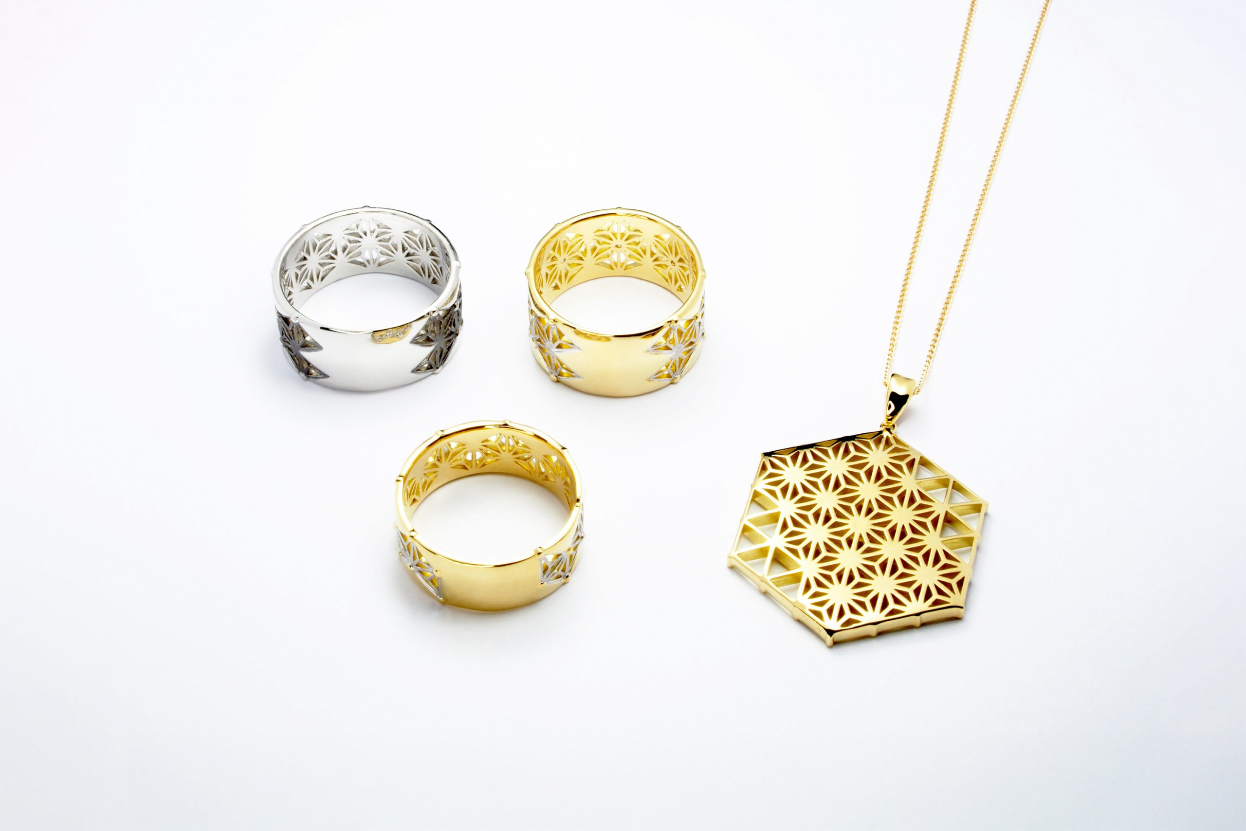 「japone. ASANOHA」は、平安時代から伝わる日本の伝統文様「麻の葉模様」をモチーフにしたジュエリーです。麻の葉模様は鎌倉時代の仏像の装飾や室町時代の建築や彫刻、染織など、古くから様々な場面で使用されてきました。美しい見た目だけでなく、魔除けや成長など縁起の良い意味を持つことから、日本を代表する文様として現代でも広く親しまれています。本製品は、その美しい模様を繊細かつ重厚感のあるデザインで表現し、日本の伝統美と現代的な感覚を融合させています。ブランドの象徴的なシリーズとなる「japone. ASANOHA」は、身につける方の人生に寄り添い、時代を超え永く愛され続けるジュエリーです。