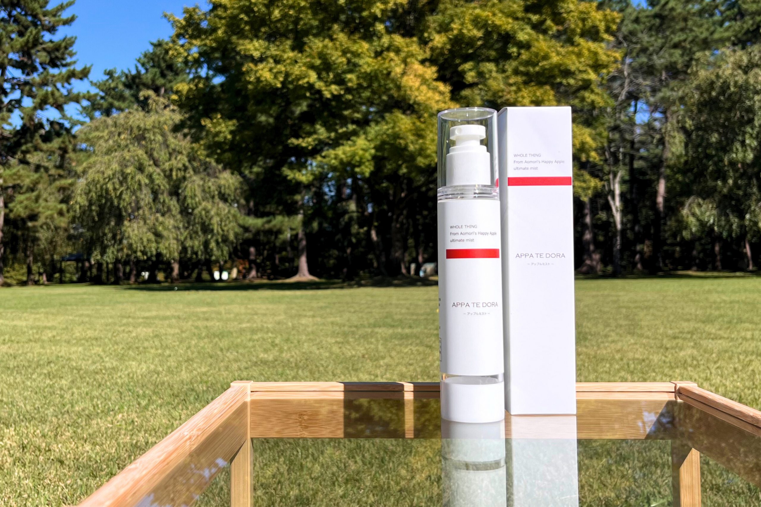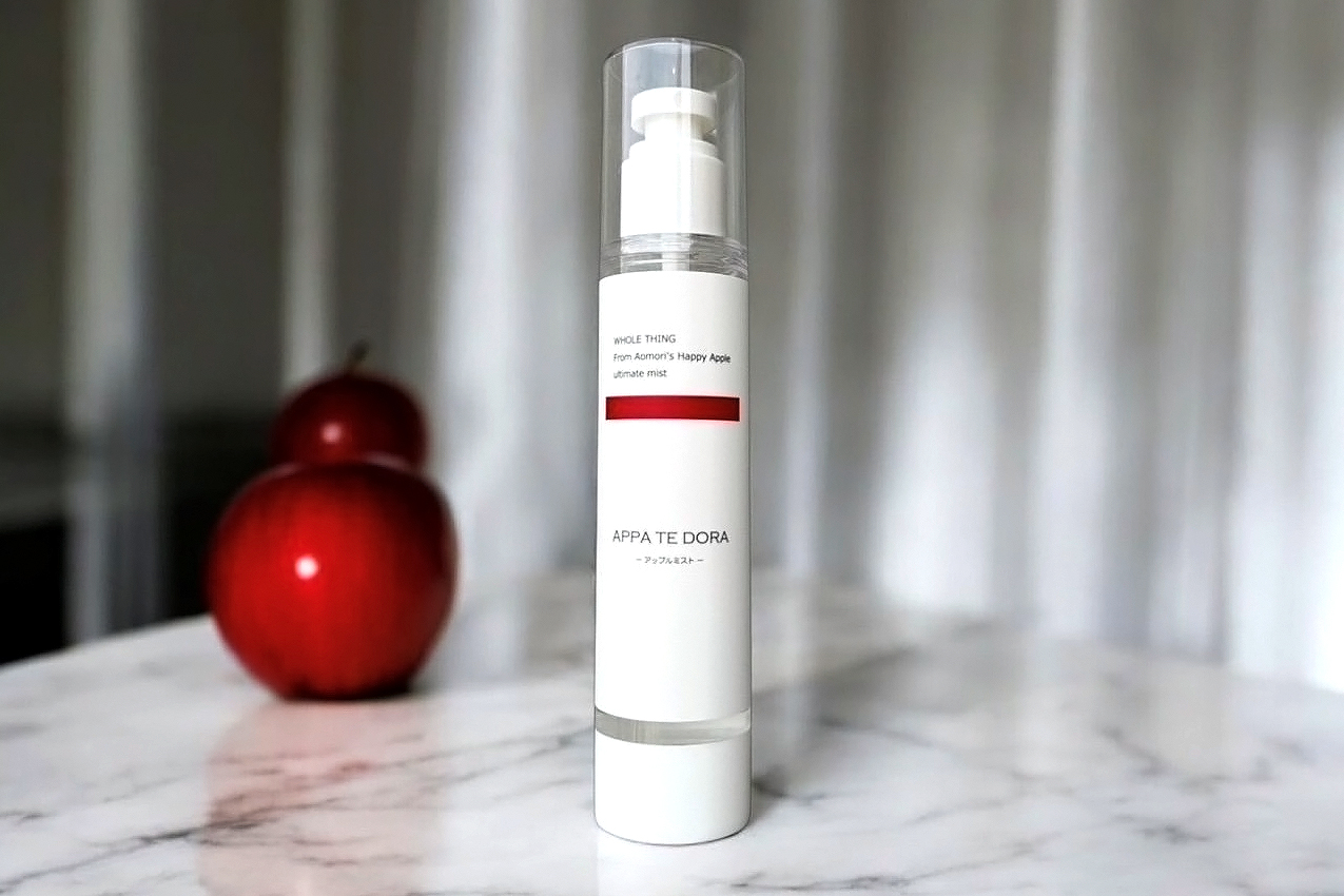 アップルミストは、「APPA TE DORA(アッパ テ ドラ)」、「奥様お手をどうぞ」という津軽弁の言葉と、日本ハルマ株式会社の理念「一物全体」に基づいて作られた化粧水です。独自の製法により津軽の新鮮なリンゴ水を使用し、ミスト状にしてお肌のキメを整え、瑞々しい透明感をもたらします。自然由来成分で作られており、敏感肌の方にも安心してお使いいただけます。日本ハルマ株式会社は、八甲田山系のチシマザサや日本一のりんごなど、地域資源を利用して、高圧圧搾と共沸分留の設備による特許技術でチシマザサ水やリンゴ水などを製造し、天然志向の化粧品や健康食品を提供しています。新規事業として、りんごのエタノール抽出からりんごセラミドなどの機能性成分を開発しています。これらの工程はいずれも、廃棄物を一切出さない「一物全体」を貫いています。青森県のりんごの生産量は全国の約60%、販売額は10年連続で1,000億円を超えていますが、その加工過程で大量の残渣が発生しています。日本ハルマでは、この残渣を原料として活用し、地域経済の振興に寄与する商品開発を行っています。ジュース加工工場からその日に出るりんご搾汁残渣を、高圧圧搾と共沸分留の特許技術で得られたリンゴエッセンスを豊富に含んだリンゴ水に変え、瑞々しさをそのままエアレスタンクに閉じ込め、最後までリンゴの爽やかさを感じることができます。アップルミストは、霧状に吹き出るスプレータイプの化粧水で、顔に直接ひと吹きするだけで、ミストが均一かつ広範囲に広がります。洗顔後だけでなく、日中、肌の乾燥が気になるときや、メイクの仕上げや直しの際にも手軽に使えるのが特徴です。