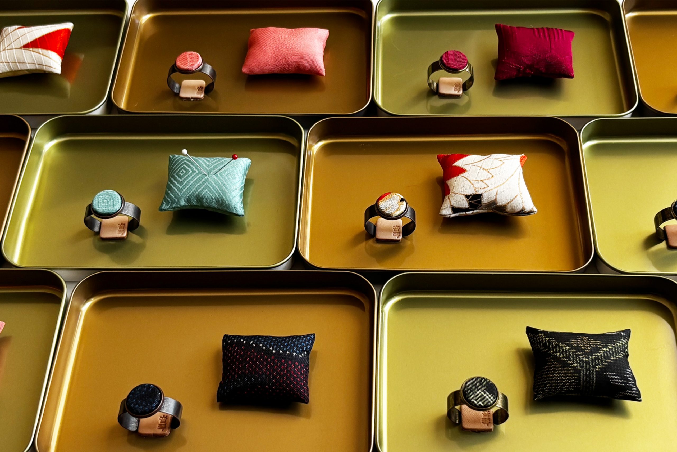 「針を落として拾えない」「道具がケースの中で散らかる」——そんな悩みを解消するために、磁石が“ぱちん”と針を吸着する感覚が楽しい指輪型針刺しや、着物をアップサイクルしたミニピンクッションをセットしました。またリングはファッションリングとしても使用可能です。これらのアイテムは実用性と美しさを兼ね備え、コンパクトで品のある缶に収められています。