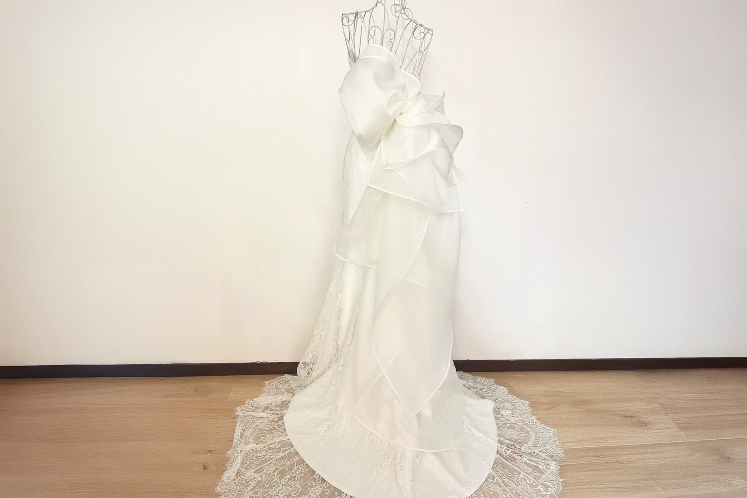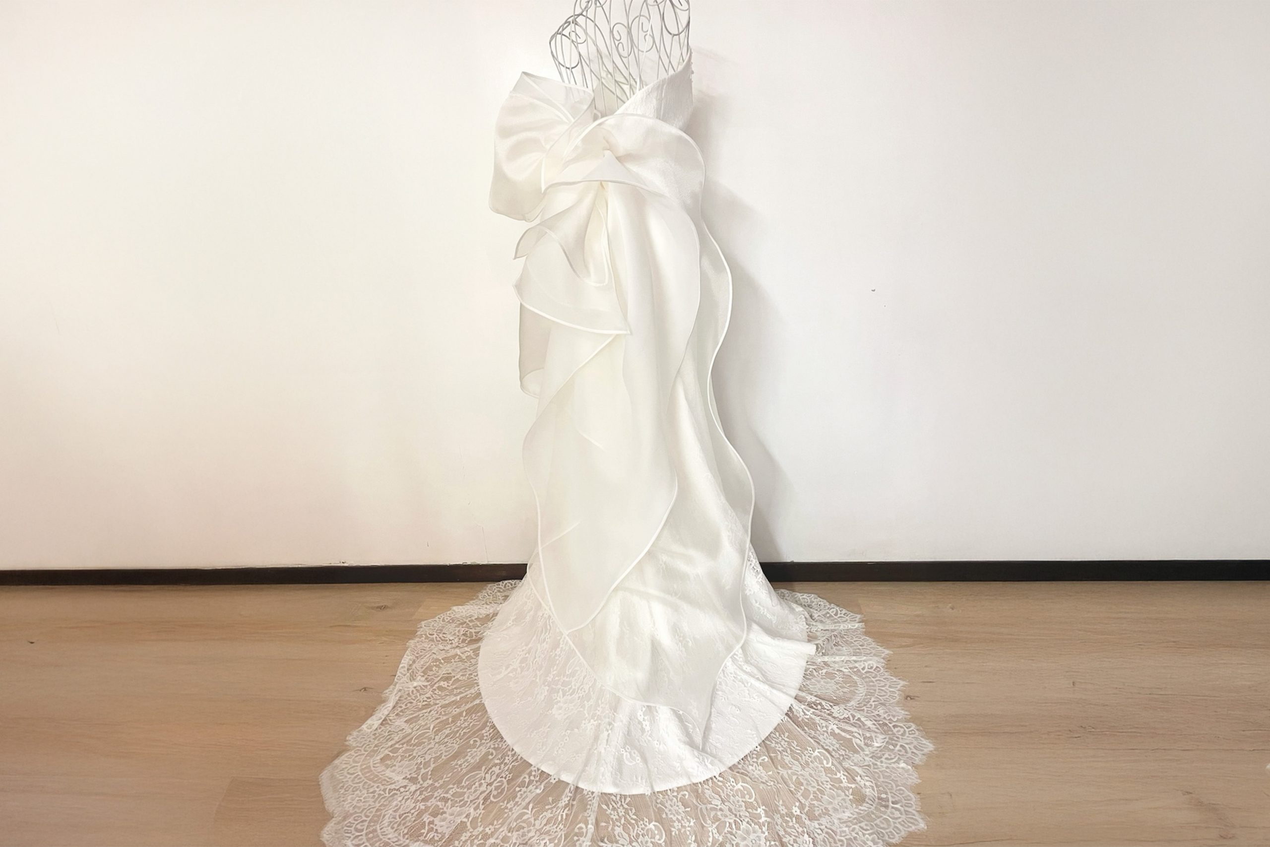 「ウェディングバックリボントレーン付き」は、Blanche de Rêveが提供する個性的で妖艶な雰囲気を持つウェディングアイテムです。リボンにはサテンオーガンザ素材を使用し、一枚の布からリボンの縁にハードなホースヘアーを施すことで立体感を出し、アシンメトリーな動きのある片リボンに仕立て上げています。リボンの隙間から覗くトレーンも同じ素材とホースヘアーを用いており、一体感を持たせつつ大きめのウェーブを描く立体感あるデザインに仕上げています。この作品は、花嫁の個性を引き立てるだけでなく、式全体の雰囲気を一気に高める効果があります。サテンオーガンザの光沢とホースヘアーの硬さが絶妙に組み合わさり、見る人の目を引く美しいシルエットを作り出します。Blanche de Rêveのこだわりが詰まったこのアイテムは、特別な日の装いにふさわしい一品です。