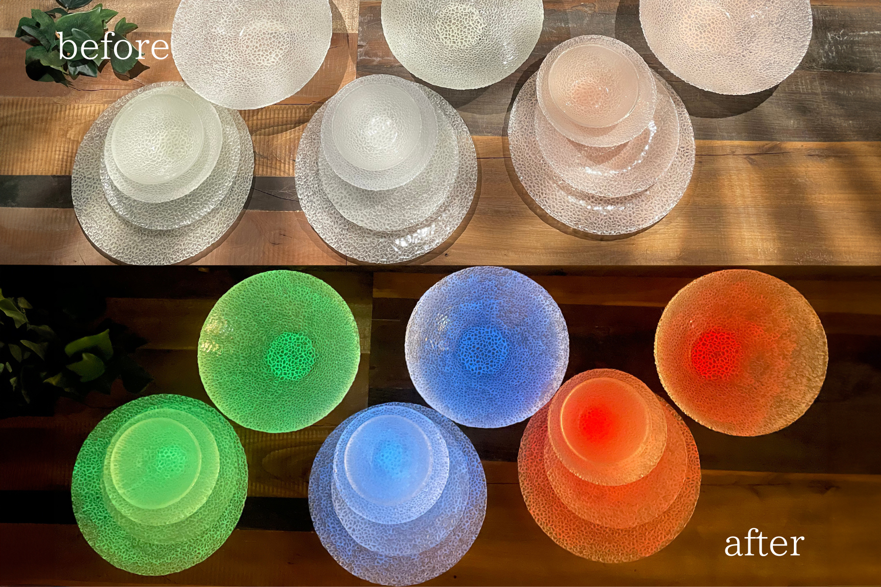 Luminous系列是餐具領域的革命性創新,在黑暗中也能發出絢麗的光芒。 「Luminous」品牌名源自於其夜光特性。其獨特之處在於內部光滑平整,外部則帶有不規則的凸起。這種設計用途廣泛,適用於各種日式、西式和中式菜餚。丸茂高木陶瓷株式會社成立於20年,總部位於岐阜縣多治見市。該公司不僅提供與傳統日式料理相得益彰的高品質餐具,還為皇室、日本大使館、酒店、餐廳甚至飛機生產餐具。其季節性的設計和精湛的工藝使其深受全球顧客的喜愛。用餐不僅需要味覺,更需要五感的共同作用。視覺訊息在其中扮演著重要的角色。作為基於「設計中的溫度」概念的產品開發的下一步,我們正在探索利用磷光材料創作以「光」為主題的產品。我們的目標是激發驚喜和愉悅。無論是特別的生日派對,還是溫馨的私人慶典,我們都希望在燈光關閉的那一刻,營造出令人驚豔的驚喜。我們前所未有的夜光盤碗定會讓您驚艷亮相。夜光系列共有紅色、藍色、綠色三種顏色,每種顏色的盤碗尺寸各不相同,方便您在各種場合靈活運用。玻璃器皿在明亮的房間裡看似透明,但它會吸收螢光燈和LED燈泡發出的紫外線,在燈光關閉的那一刻,蛋糕盤便會神奇地發光。這營造出如夢似幻的景象,定會讓您目不轉睛。但請注意,盤碗的顏色可能會因環境光線而改變。此外,請勿使用洗碗機或高溫清洗。